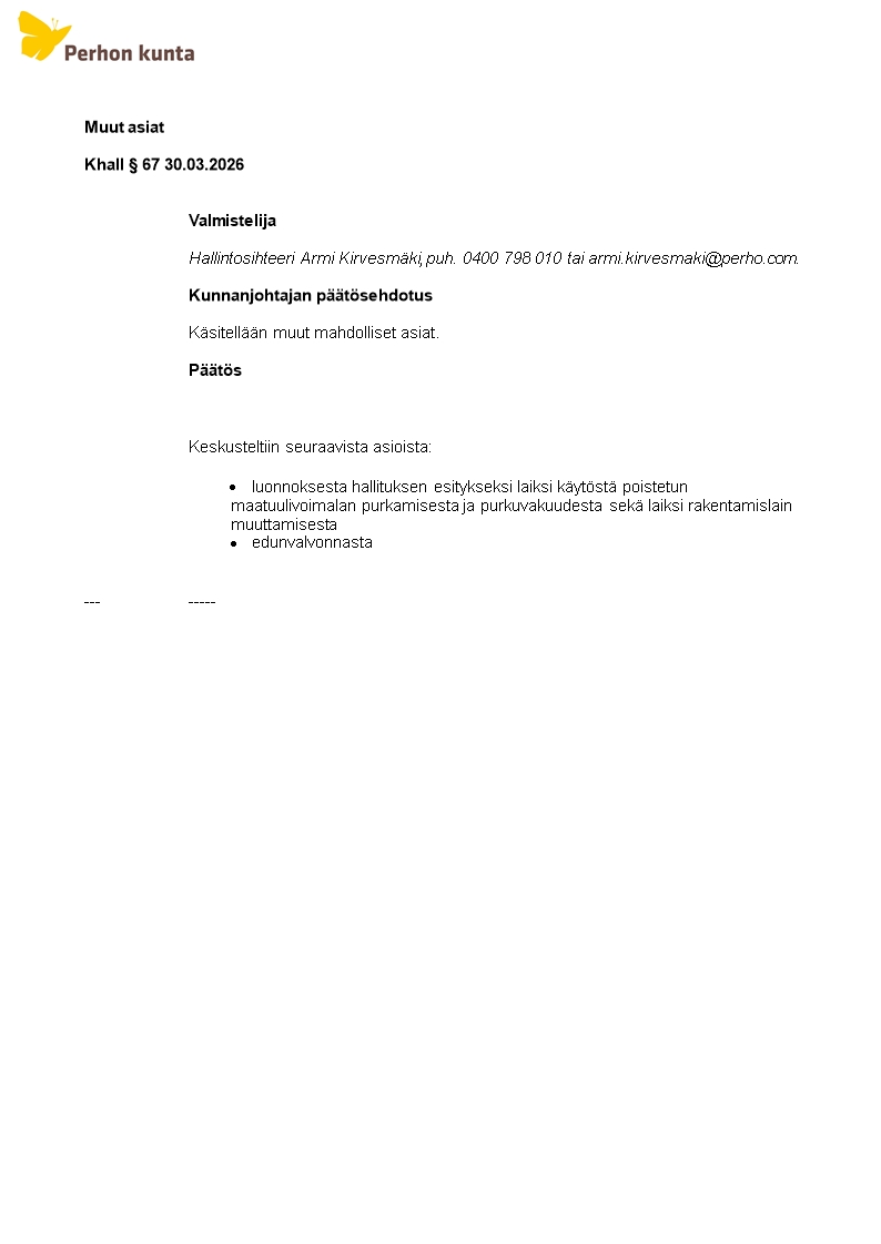 Pöytäkirja 30.03.2026/Pykälä 67